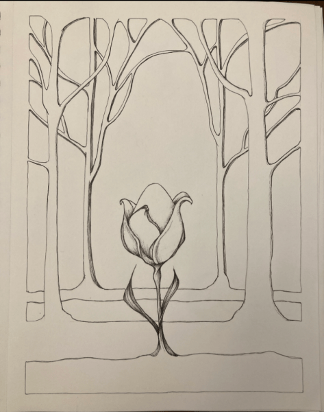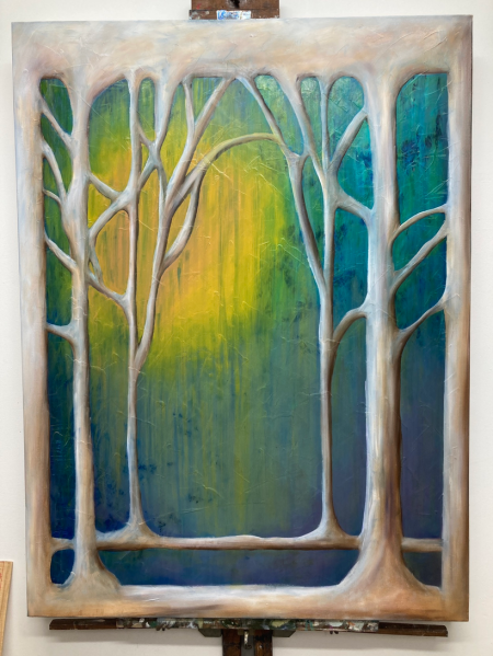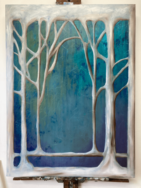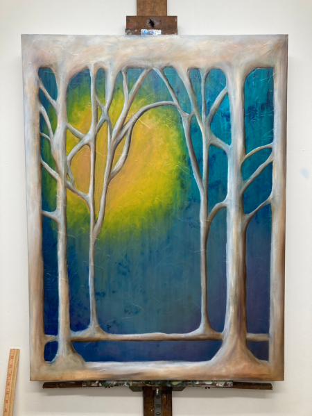 I ultimately didn’t (and don’t) love the little egg plant in the middle, but the way the trees came together in various places and the notion of a background peeping through that structure really stuck with me.