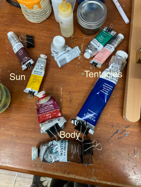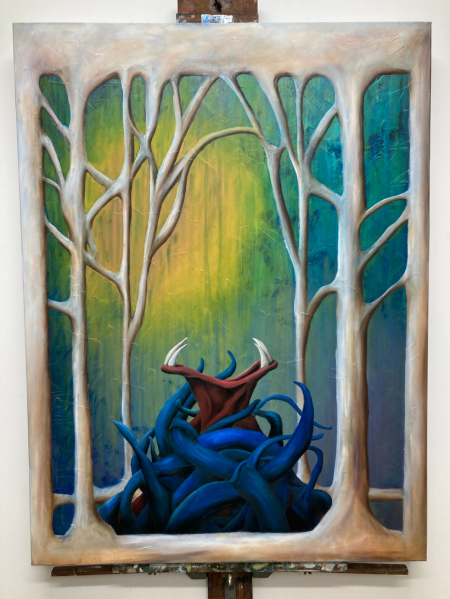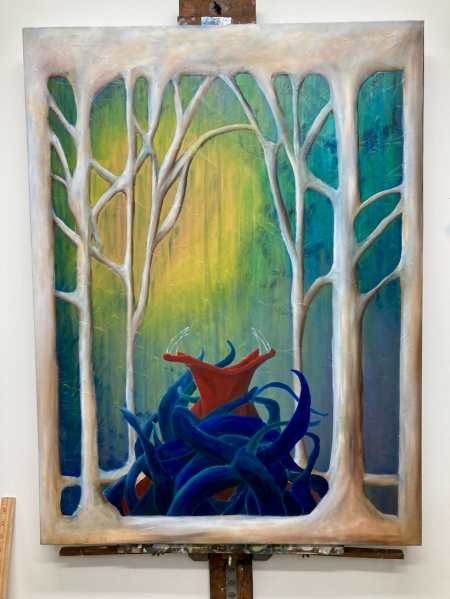 I’ve made some missteps here. I can see them – BUT, as a first go at blue I’m pleased. Now I let it all dry and go back in for detailing and glazing and pulling it together. I need to mull how I will harmonize that blue with the sunlight and the background. Pulling that yellow into the tentacle highlights may be the key. It’s a bit too powerful – but also, this all pleases me. I feel like I’ve got some mojo back that has left me for a few weeks. Feels good.