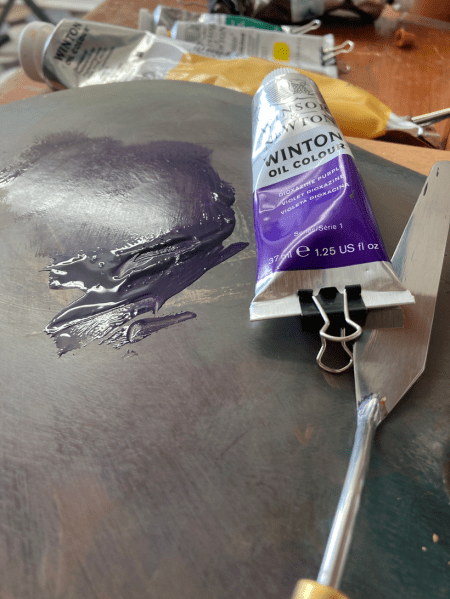 The changes at this point may seem subtle. I wanted to increase the contrast with some darkness along the bottom, so I thinned up some Diozazine Purple with linseed oil (pic below so maybe you can get an idea of how the thinned paint looks on the palette) and applied very thinly. Lots of brushing and fanning the color out with this one.