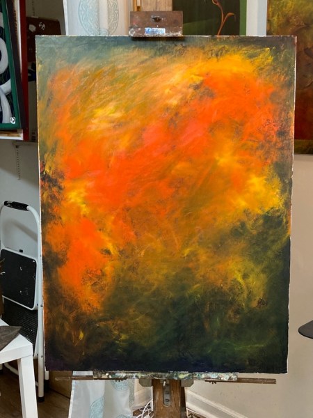 Here’s where I started … just a rough slapping in of paint. I’d done the dark background ages ago and don’t have a pic (I’m a slacker). After that dried a bit I came back through with the oranges and the yellows and just scraped them on with my palette knife.