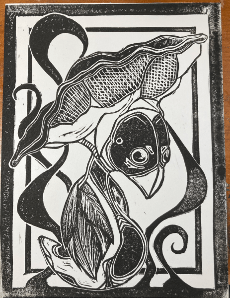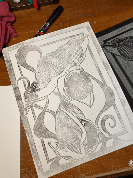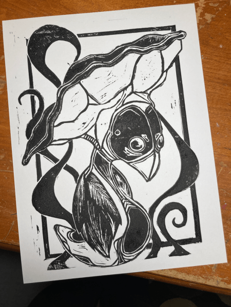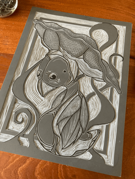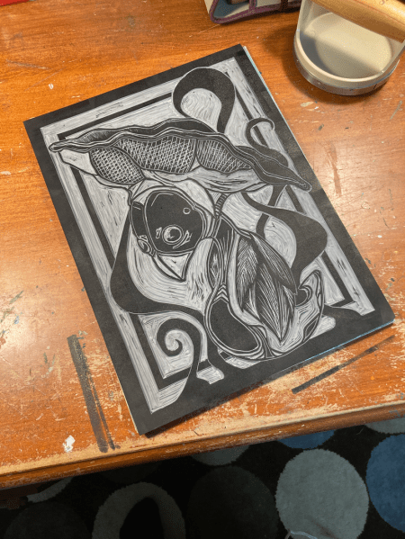 Sidenote: I did also attempt a new piece, carving into a rubber block rather than linoleum. Rubber is NOT my medium. It’s so soft that lines are distorted during the printing and fine details are not going to hold well from what I can tell. It also feels like carving some mushy alien construct. Feels awful under the hands. Frustrating but a lesson learned. I’m 110% sure I will find a good use for these rubber blocks going forward but if you have any suggestions I’m open to them.