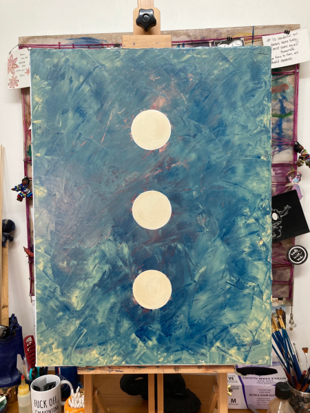 I tossed a little bit of naples yellow/zinc white in the circles to cover the canvas in those spots and now I sit with it – satisfied with the first steps … and completely ignorant of the next ones.