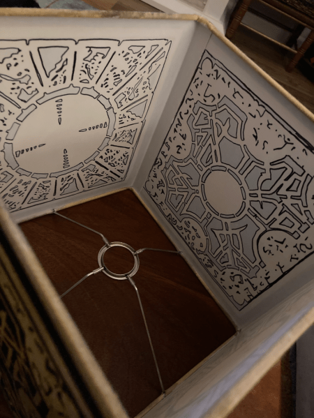 The pattern was done via a printed stencil taped to the inside of the shade and my handy phone flashlight letting me lightbox the image.