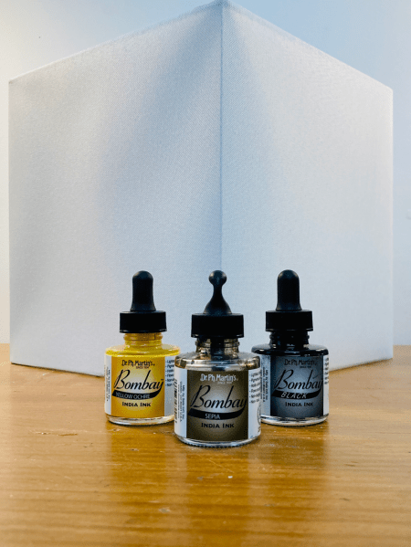 I started with a wash of india ink, sepia and yellow ochre and a paintbrush and a bunch of water and a lot of hope – and it delivered. (I ended up not using the black but he photobombed all the pics anyway).